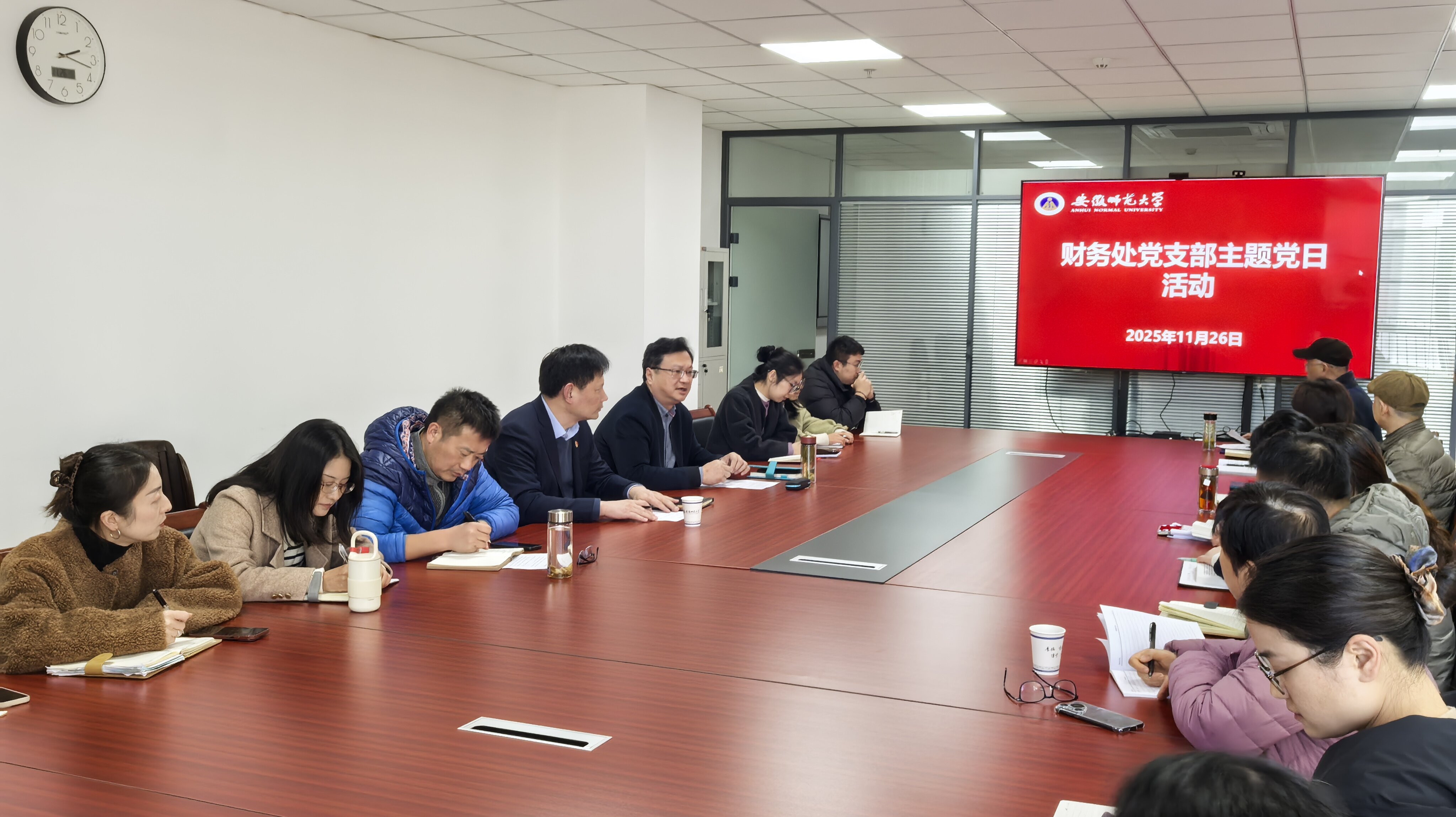 2025年11月26日,财务处在文典楼A414会议室开展主题党日活动,校党委常委、副校长王刚以普通党员身份参加并指导,会议由支部书记黄强主持,全体在职党员和财务处入党积极分子参加活动。